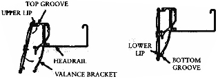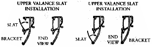 Place the lower edge of the slat into the center groove in the valance bracket. Now Carefully snap the upper edge of the slat into the top groove in the bracket. Repeat this at each bracket across the blind. The Lower valance slat is installed in the same manner by placing its lower edge into the lower groove in the valance bracket and carefully snapping the upper edge into the center groove of the bracket. The slats may be trimmed with scissors if necessary.