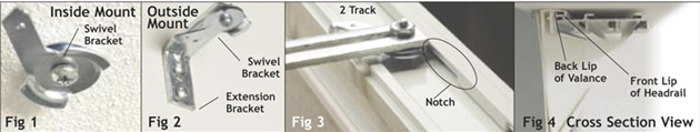 Note: When a two track headrail is used with a valance (as in fig 3), the valance will come with slots to accommodate the swivel brackets. The swivel brackets must be located so they are aligned with these slots.