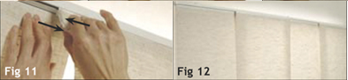 Pull forward on the bottom of the front panel carrier and pushing back on the bottom of the back panel carrier, slide the back carrier from behind the front carrier (fig 8). Repeat this action for the number of panels on your headrail. Align the Velcro strip at the top of the panel with the Velcro strip on the front face of the panel carrier. Beginning at one end press the Velcro strips together across the panel carrier. Be sure to go back and press the Velcro to ensure a secure attachment (fig 9&10). Repeat this step until all panels are attached. After all panels have been installed, return the carriers to their original positions (fig 11). Once finished the panels should all overlap as in (fig 12).