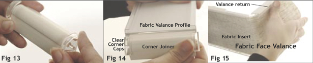 Fabric Valance: Attach the clear corner caps to the valance return joiners (fig 13&14). Attach the valance returns to the joiners. Attach the valance returns to the valance face. Insert the valance fabric across the valance face , around the corner joiners to the end of the returns (fig 15). Trim off any excess fabric.