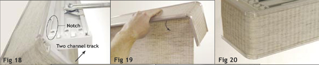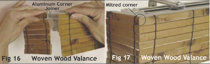 Woven Wood Valance: Identify the right and left valance returns, insert the L-shaped aluminum corner joiners into the ends of the valance face. Slide the returns onto the joiners until the mitered corners meet (fig 16&17).