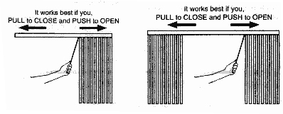 TO OPEN OR CLOSE THE LOUVERS, first rotate the louvers open. Then, push or pull the wand to open (stack louvers) or close (unstack louvers) the blind.