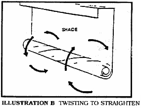 If your shade doesn't lie flat against the wall or window, roll the shade tightly from the bottom and twist roll (illustration B) clockwise on one side, counter clockwise on the other, and this will align the yarn and slats. Should a strand of yarn slip off the edge of the shade, remove the strand from top to bottom - this will in no way affect the strength of the shade