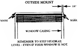 For an Outside mount, hold the blind level and centered against the widow casing. Mark the casing with a pencil just below the headrail on each end. Also mark the window casing 1/8" beyond the ends of the headrail. The right and left installation brackets will be placed on these marks.