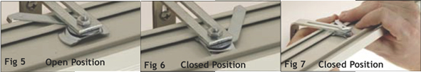 Rotate the swivel brackets to the open position (fig 5). Raise headrail to brackets, you may have to adjust the swivels to receive the track. Once headrail is in position, rotate the swivel brackets to the closed position (fig 6&7).