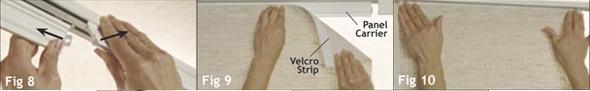 Pull forward on the bottom of the front panel carrier and pushing back on the bottom of the back panel carrier, slide the back carrier from behind the front carrier (fig 8). Repeat this action for the number of panels on your headrail. Align the Velcro strip at the top of the panel with the Velcro strip on the front face of the panel carrier. Beginning at one end press the Velcro strips together across the panel carrier. Be sure to go back and press the Velcro to ensure a secure attachment (fig 9&10). Repeat this step until all panels are attached. After all panels have been installed, return the carriers to their original positions (fig 11). Once finished the panels should all overlap as in (fig 12).