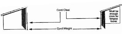 A Cord weight and cord cleat should be attached to blind instead of tension pulley and cord clip. Since the blind is mounted at an angle, the louver holders will tend to slide "downhill". A cord cleat is provided to wrap the cord around and prevent the louvers from sliding.